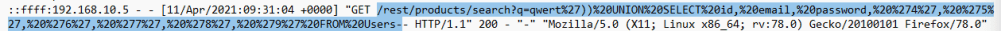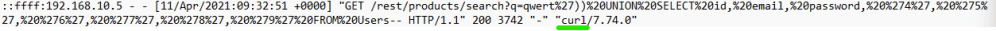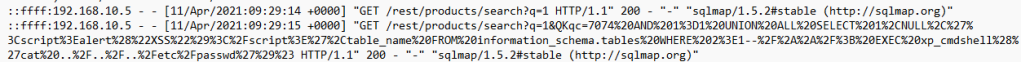 Endpoint podatny na atak typu SQL Injection znalazłem sprawdzając logi access.log, gdzie widać, że narzędzie SQLmap atakowało /rest/products/search?q=query…. Widać również od razu, że do ataku został wykorzystany parametr q:
