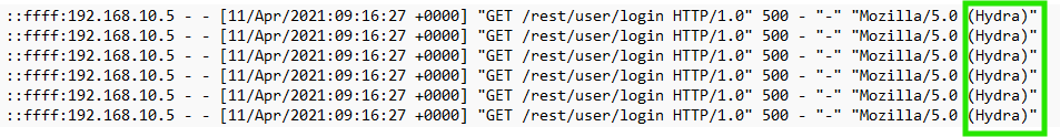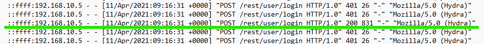 Wrażliwym endpointem okazało się być /rest/user/lgin – ponieważ po wykonaniu ataku bruteforce narzędziem Hydra widać, że z tego miejsca nasąpiła dalsza exfiltracja środowiska: